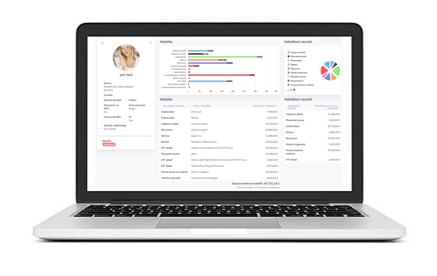 Omogoča celovito vodenje različnih vrst naložb, vključno z nepremičninami, alternativnimi naložbami, fizičnimi oblikami zlata, depoziti in njihovimi obrestmi, kriptovalutami, delnicami ter vzajemnimi in ETF skladi. Ne glede na to, ali vlagate v klasične ali bolj specializirane naložbene strategije, boste zdaj imeli vse pod nadzorom na enem mestu.